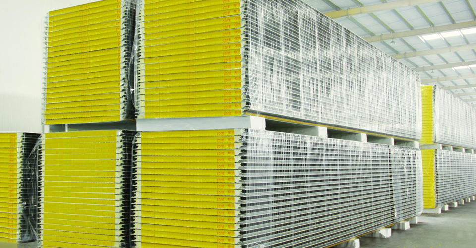 聚氨酯封邊巖棉夾芯板新型防火巖棉夾芯板是選用兩層高品質(zhì)的彩色涂層鋼板或其他精密壓型的金屬板材做面板,輥壓成型后,將分條后的巖棉90度翻轉(zhuǎn)(使其纖維垂直于上下兩層鋼板),通過高強度的、高粘結(jié)力的、高防火